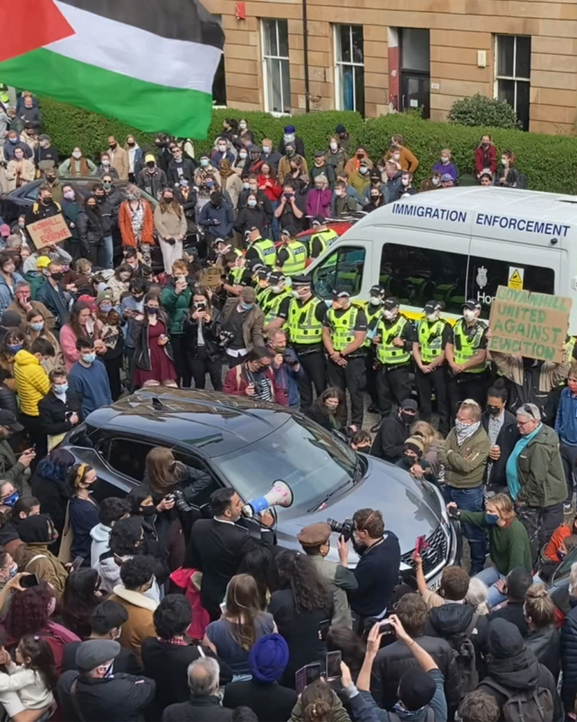 It’s a quiet Thursday morning in Glasgow, the first day of Eid. A white van from Immigration Enforcement rolls into one of the city’s most diverse neighborhoods. At dawn, the authorities have raided Kenmure Street and detained two men who are facing deportation. But that’s not how it’s going to be. A passerby simply crawls under the van so it can’t drive away. Rumors spread like wildfire among the row houses. The neighbors drop what they have in their hands and gather in the street. Soon, hundreds of people surround the van.
