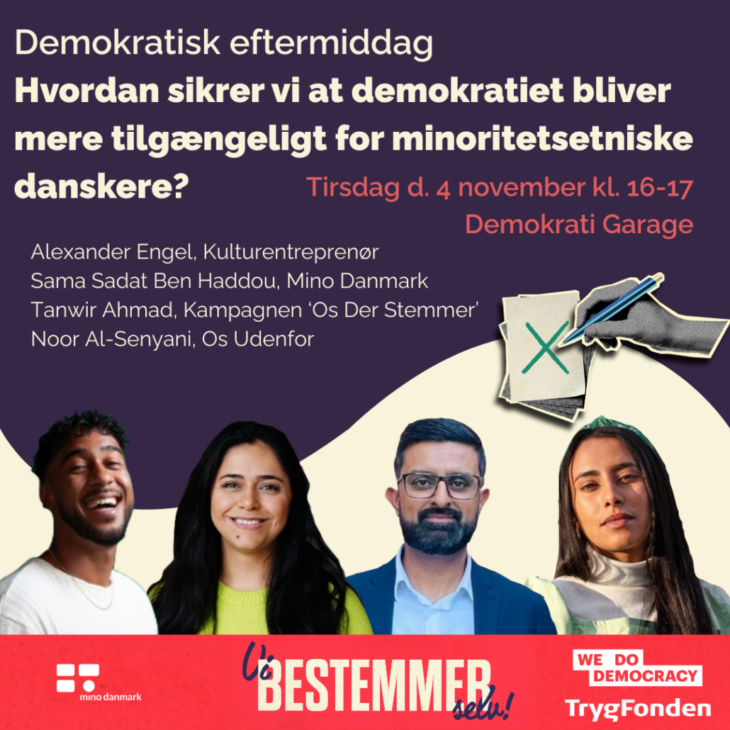 Vi inviterer civilsamfundsaktører til at dele deres perspektiver på, hvad der står i vejen for demokratisk deltagelse – og hvordan vi i fællesskab brolægger vejen til et inkluderende demokrati med bredere deltagelse? Kulturentreprenør Alexander Engel vil være moderator for en samtale med Sama Sadat Ben Haddou, Generalsekretær i Mino-Danmark og Tanwir Ahmed, initiativtager til kampagnen “Os der stemmer” og Noor Al-Senyani, forperson i Os Udenfor.